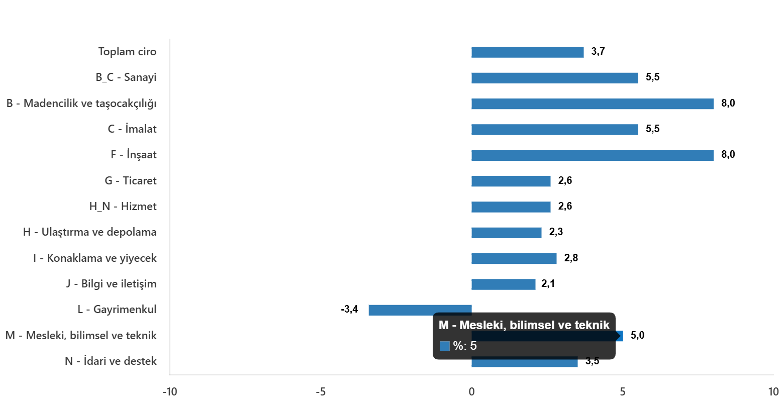 Toplam cironun alt ayrıntılarına bakıldığında; 2025 yılı Kasım ayında aylık sanayi bölümü ciro endeksi %5,5 arttı, inşaat ciro endeksi %8,0 arttı, ticaret ciro endeksi %2,6 arttı, hizmet ciro endeksi %2,6 arttı.