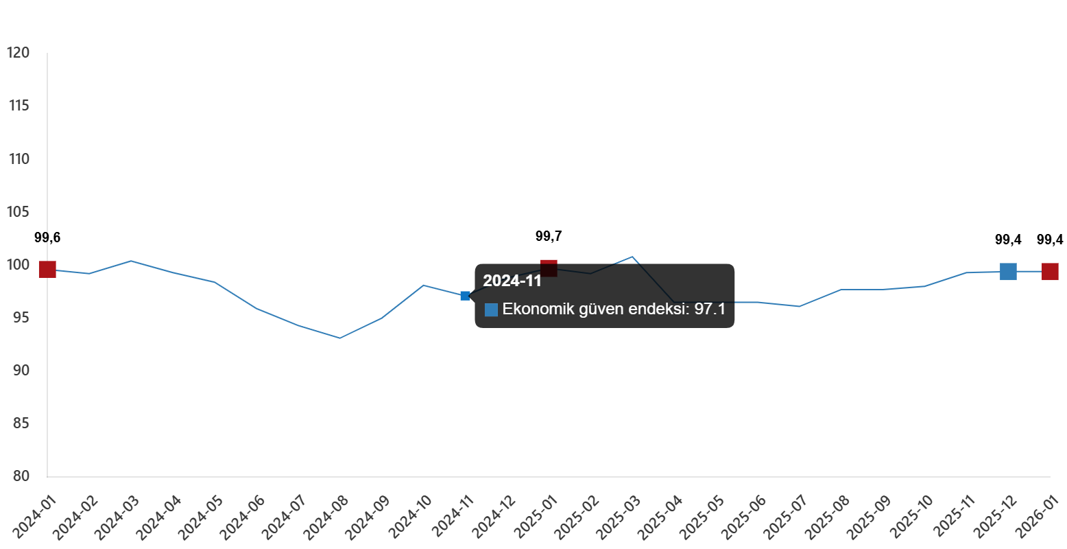 Ekonomik itimat endeksi Ocak ayında birebir seviyede kalarak 99,4 kıymetini aldı.