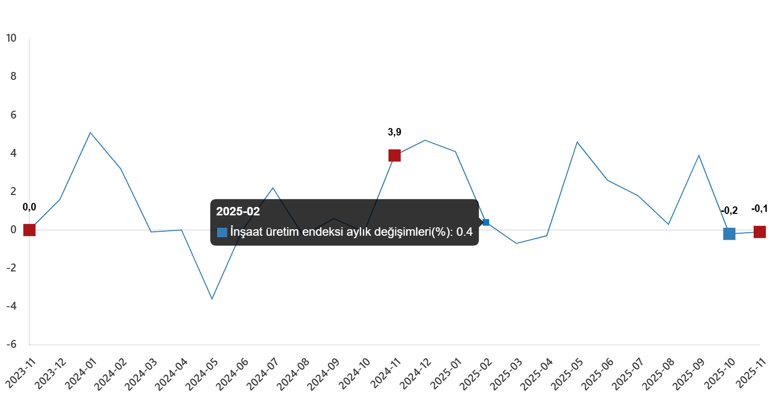İnşaatın alt bölümleri incelendiğinde, 2025 yılı Kasım ayında bina inşaatı kesimi endeksi bir evvelki aya nazaran %0,3 arttı, bina dışı yapıların inşaatı dalı endeksi %0,4 arttı ve özel inşaat faaliyetleri bölümü endeksi %1,8 azaldı.