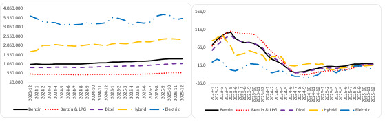 Şekil 4: Yakıt tipine nazaran ortalama araba fiyatı (TL) (Sol panel), yakıt cinsine nazaran ortalama araba fiyatının yıllık değişimi (%) (Sağ panel)