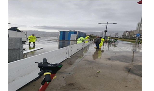 İzmir’de tesirli olan yağış ve kuvvetli rüzgârla birlikte deniz düzeyi dalgalanmaları yaşanırken, İzmir Büyükşehir Belediyesi takımları Bostanlı, Pasaport ve Alsancak Kordon başta olmak üzere kritik noktalarda anlık izleme ve müdahale çalışmalarını sürdürüyor.