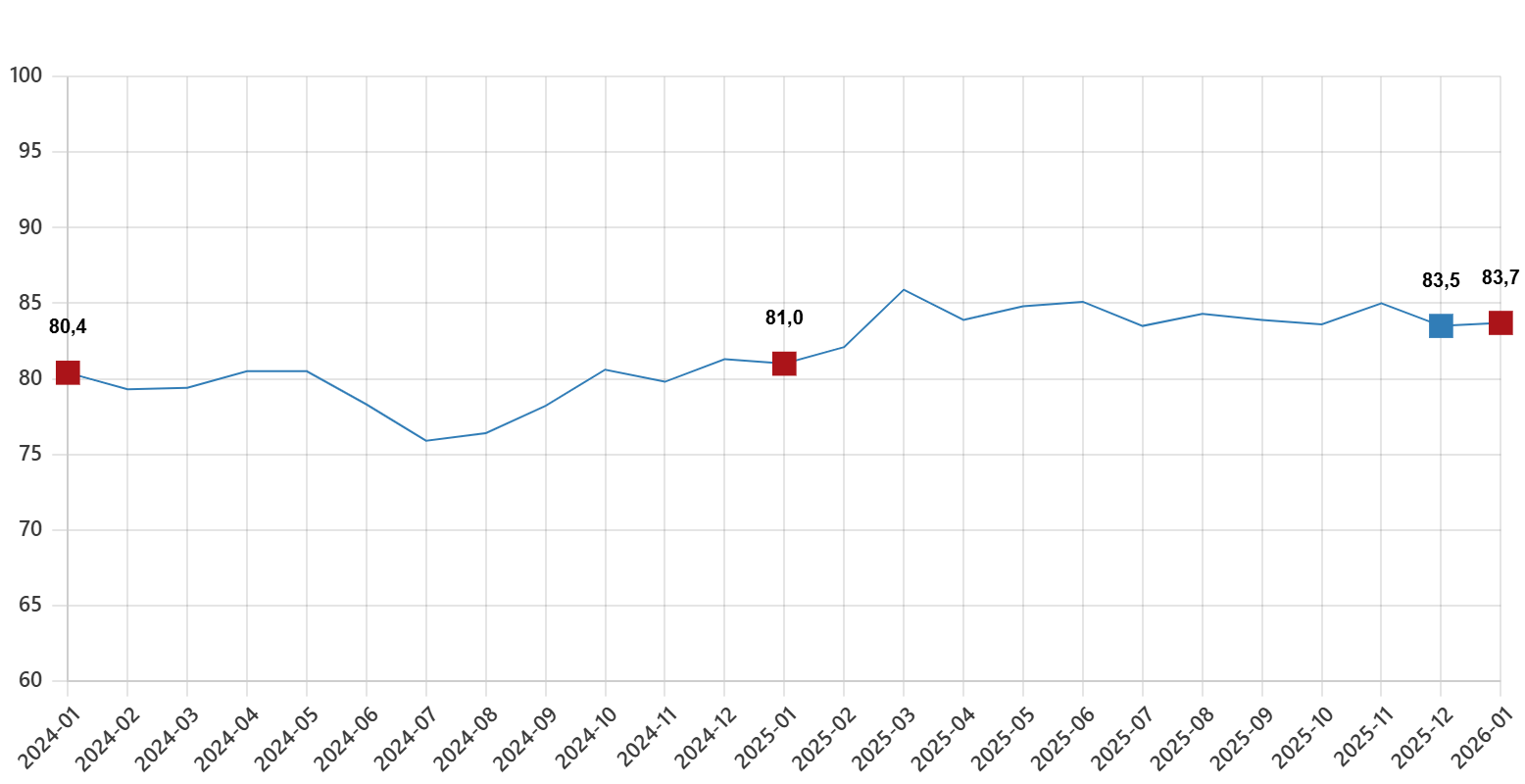 Türkiye İstatistik Kurumu ve Türkiye Cumhuriyet Merkez Bankası işbirliği ile yürütülen tüketici eğilim anketi sonuçlarından hesaplanan tüketici itimat endeksi, Aralık ayında 83,5 iken Ocak ayında %0,3 oranında artarak 83,7 oldu.
