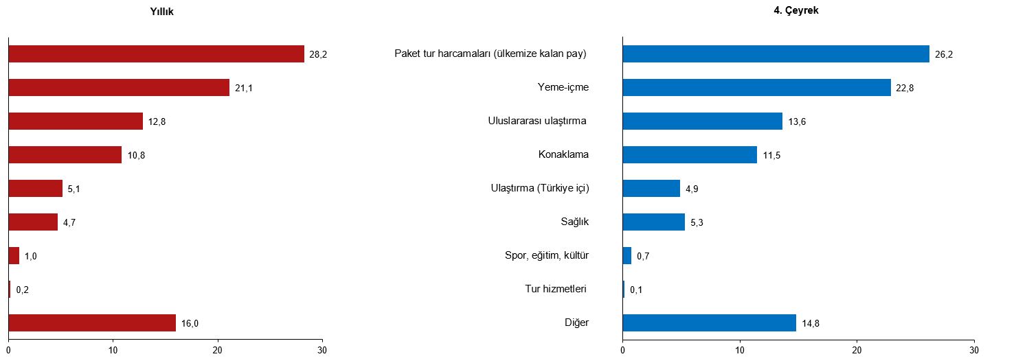 Bu çeyrekte ziyaretçilerden elde edilen turizm geliri içerisindeki paket tıp harcamalarının hissesi %26,2, yeme içme harcamalarının hissesi %22,8, milletlerarası ulaştırma harcamalarının hissesi ise %13,6 oldu. Bir evvelki yılın birebir çeyreğine nazaran paket çeşit harcamaları %5,5, yeme içme harcamaları %20,8 ve milletlerarası ulaştırma harcamaları %15,2 arttı.